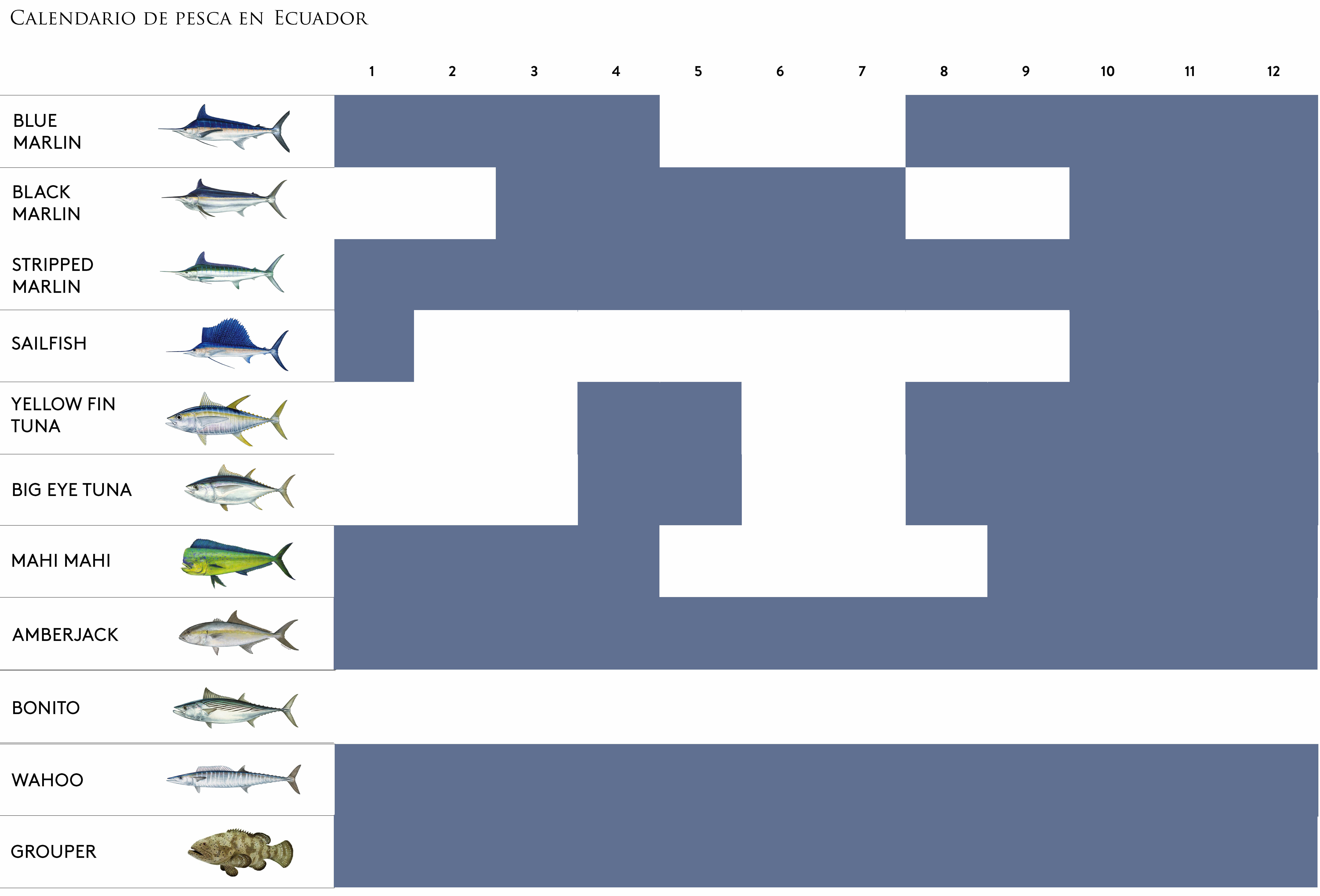 En Manta los mejores meses para la pesca son de noviembre a abril para la mayoría de las capturas, es muy recomendable tentar black marlin de de mayo a enero, mientras que en Esmeraldas la mejor época para el black marlin es de junio a octubre.